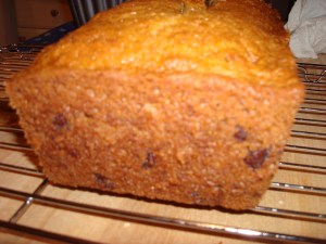 My brother’s lush backyard garden, which sprouted the above mammoth zucchinis, inspired me to make something with the vegetable while it is at the peak of the season. While incorporating the zucchini into a nice fresh frittata would have been the healthy way to go, I was in the mood for baking and opted for something sweet. I halved Paula’s recipe in order to make a single loaf, and omitted the pecans and orange zest. Though it needed to bake much longer in my oven than Paula suggested, this was delicious!